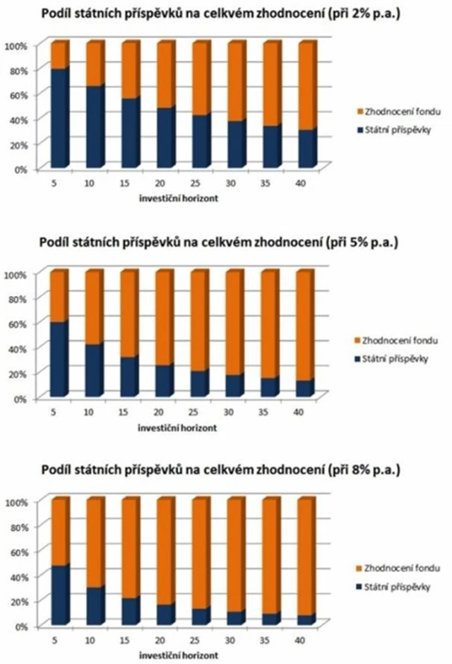 Se vznikem nových účastnických fondů, a tedy i novými možnostmi investiční strategie, má na celkovém zhodnocení vkladů nezanedbatelný vliv i zhodnocení samotného fondu. Čím vyšší zhodnocení poskytne fond, tím menší podíl mají na celkovém zhodnocení státní příspěvky. Na následujících grafech lze názorně vidět, jak podíl státních příspěvků na celkovém zhodnocení prostředků s prodlužujícím se horizontem klesá. Zejména v případě, když budeme kalkulovat s vyšším zhodnocením fondu.