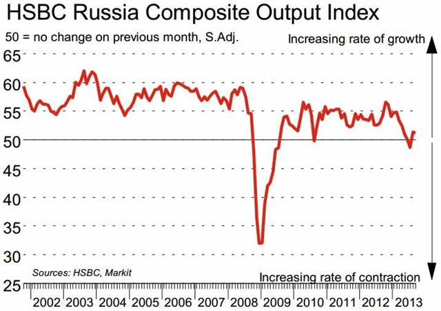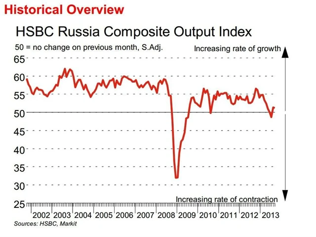 Aktivita v ruském sektoru služeb v září byla i nadále vysoká, tempo expanze se však oproti srpnu mírně zpomalilo. Kompozitní index nákupních manažerů lehce klesl na 51,2 bodu ze srpnových 51,4 bodu, stále se však nachází nad padesátibodovou hranicí dělící expanzi od kontrakce. Index nákupních manažerů pro sektor služeb také mírně spadl na 51,5 bodu z 51,8 bodu. Čtvrtletní průměr 50,7 bodu je však nejnižší od druhého kvartálu roku 2009.