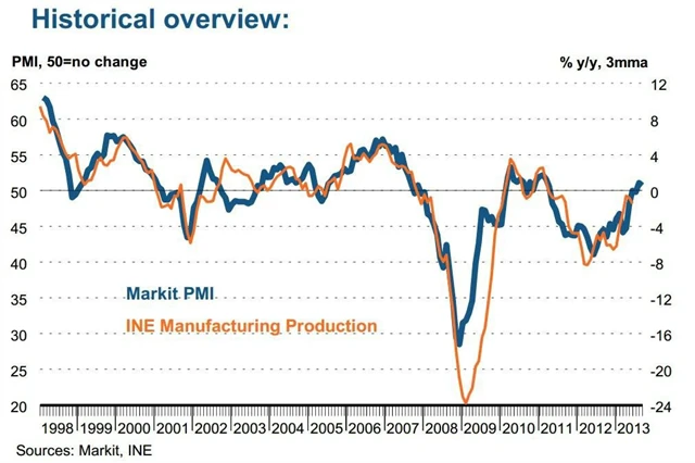 Expanze španělského zpracovatelského sektoru se v září mírně zpomalila. Index nákupních manažerů spadl na 50,7 bodu z 51,1 bodu v srpnu. Produkce sektoru dále roste, ale pomalejším tempem. Zato nové zakázky výrazně podpořil růst exportu. Oživení sektoru tak v září pokračovalo, přestože zaměstnanost je stále slabá a opět klesala. Inflační tlaky zůstávají utlumené, přestože poprvé za sedm měsíců byl zaznamenán růst cen vstupů.