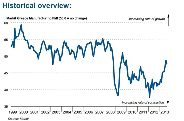 Index nákupních manažerů ve zpracovatelském sektoru v Řecku v září spadl ze srpnového 44měsíčního maxima 48,7 bodu na 47,5 bodu. Znovu se propadly nové zakázky a export a nečekaně spadly ceny vstupů. Kvůli nižším zakázkám proto klesala i produkce celého sektoru. Zaměstnanost na druhou stranu sice rovněž klesala, ale nejpomalejším tempem od ledna 2010.