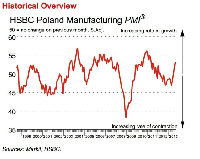 Index nákupních manažerů ve zpracovatelském průmyslu v září v Polsku vzrostl na 53,1 bodu z 52,6 bodu, nejvýše od dubna 2011. Průměrný výsledek pro třetí kvartál (52,3 bodu) byl nejvyšší od druhého čtvrtletí roku 2011. Expanzi táhly nahoru především nové zakázky a zaměstnanost v sektoru.