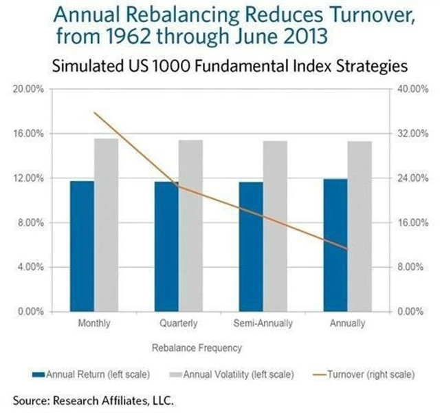 Chris Brightman z Research Affiliates v článku o fundamentálně vážených indexech přibližuje způsoby optimalizace portfolia. Jedním z nich je vhodně přizpůsobit frekvenci rebalancování. Taková optimalizace sice nemá velký dopad na volatilitu a výnosy, může ale výrazně ovlivnit transakční a daňové náklady.