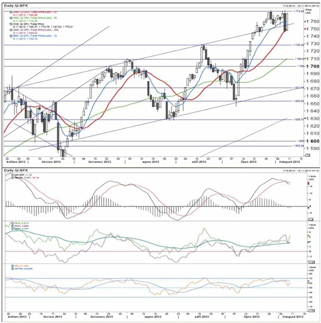 1 758 rostoucí (horní) trendová linie, 1 750 20denní (exponenciální) klouzavý průměr, 1 710 50denní (exponenciální) klouzavý průměr, 1 700 psychologická úroveň, 1 600 psychologická úroveň.