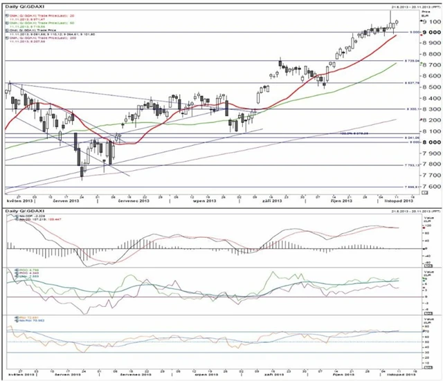 9 000 psychologická úroveň, 8 971 20denní (exponenciální) klouzavý průměr, 8 720 50denní (exponenciální) klouzavý průměr, 8 208 200denní (exponenciální) klouzavý průměr.