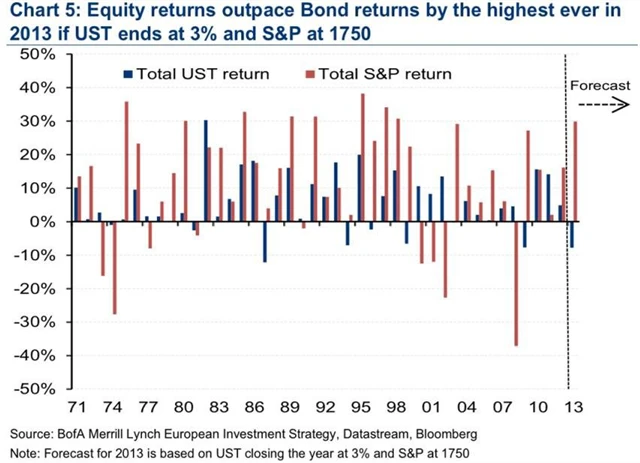"Manažeři velkých portfolií by po zbytek roku mohli mít velkou chuť alespoň část peněz, které vydělali na akciích, stáhout z trhu," myslí si stratég z Bank of America Merrill Lynch John Bilton. "Dluhopisy mají nakročeno k nejhoršímu ročnímu výsledku od roku 1987. Pokud index S&P 500 zakončí rok na hladině 1 750 bodů a 10leté dluhopisy budou vynášet 3 %, akcie porazí dluhopisy o zhruba 37 procentních bodů, pokud jde o celkový výnos z jednotlivých investic. To by byl největší rozdíl za 40 let."