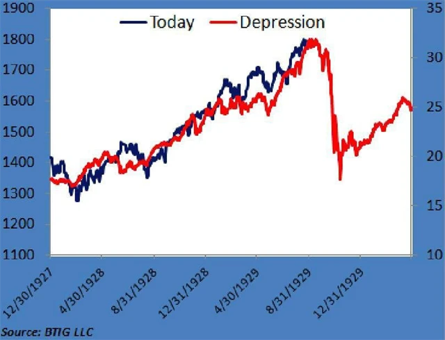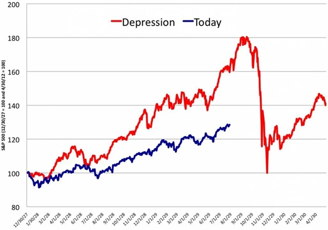 Ukazuje to například graf, který si v posledních dnech na Wall Street prý vysloužil hodně pozornosti. Jde o srovnání současného vývoje cen akcií se situací na trhu na konci 20. let minulého století.