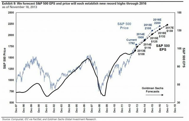 Akciový stratég z Goldman Sachs David Kostin přišel s předpovědí vývoje indexu S&P 500 až do roku 2016. Podle něj index v příštím roce vzroste na 1 900 bodů, v roce 2015 přidá 15 % na 2 100 bodů a v roce 2016 dalších 23 % na 2 200 bodů.