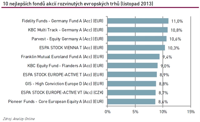 Kladný růst a oslabení koruny přály zejména výsledkům fondů akcií evropských rozvinutých trhů, které během uplynulého měsíce získaly 7,9 %. Největší výkonnost z nich měl fond Fidelity Funds – Germany Fund A (Acc) (EUR), který je zaměřen na německý trh. Z fondů denominovaných v české koruně se pak v tomto segmentu nejlépe dařilo fondu ESPA STOCK EUROPE-ACTIVE VT (Acc) (CZK). Od začátku roku získali investoři investující do fondů akcií evropských rozvinutých trhů již více než 30 %.