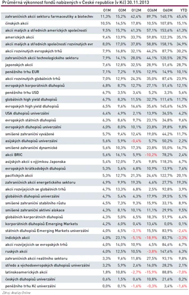 Průměrná výkonnost ve skupinách fondů a výkonnost jednotlivých fondů byly přepočteny na české koruny podle kurzu České národní banky. Výkonnost indexů, které byly zmíněny v textu, je uvedena v měně indexu (v závorce je uveden název příslušné měny). Výsledky představené v reportu vycházejí z výsledků více než 900 fondů nabízených na českém trhu (registrovaných v České republice i v zahraničí). Fondy jsou rozděleny do skupin podle metodologie společnosti Analizy Online a na základě své investiční politiky. Základem pro klasifikaci jsou podoba investiční politiky fondu definovaná v jeho stanovách, informace o složení portfolia a struktura benchmarku.