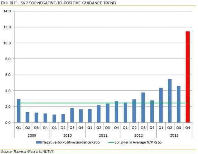 Druhý graf hovoří sám za sebe - podíl firem, které varovaly před zhoršením své ziskovosti oproti předchozím odhadům, je na americkém trhu nejvyšší za řadu let. Navíc v posledním kvartálu významně narostl. Opatrné firmy po pěti letech býčího trhu a téměř čtyřech letech ekonomického oživení v USA? To nevěstí nic dobrého, stále jde ovšem "jen" o výhledy.