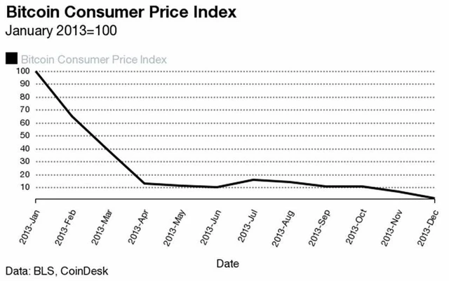 Bitcoin může být Paypal 2.0, ale nikdy z něj nebude dolar 2.0. Ne v případě, že ceny zboží v bitcoinech propadnou za rok až o 98,5 % jako letos.