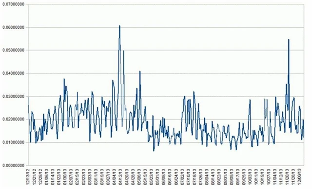 Reakce je zřejmá - lidé za ně téměř nenakupují. Podle průzkumů leží 64 % bitcoinů na účtech, které nikdy nebyly použity. A ty, které použity jednou byly, už nebyly použity znovu. Graf, který sestavil Jason Kuznicki z Cato Institute, ukazuje podíl dolarové hodnoty všech bitcoinových transakcí a dolarové hodnoty všech bitcoinů v oběhu. Je těžké v grafu najít nějaký trend, prostě tam není. Pokud by lidé používali bitcoiny více, tento poměr by rostl, ale neroste.