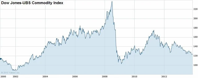 Do začátku července 2008 zaznamenával komoditní index Dow Jones UBS fenomenální nárůsty, v souvislosti s rychle rostoucími mladými ekonomikami z bloku BRIC se hovořilo o komoditním supercyklu. Od té doby, poznamenán světovou finanční a dluhovou krizí, která dolehla i na rozvíjející se země, se index – na rozdíl od svých akciových kolegů ve vyspělém světě – nevzchopil. Spíše má tendenci klesat. Na jak dlouho?