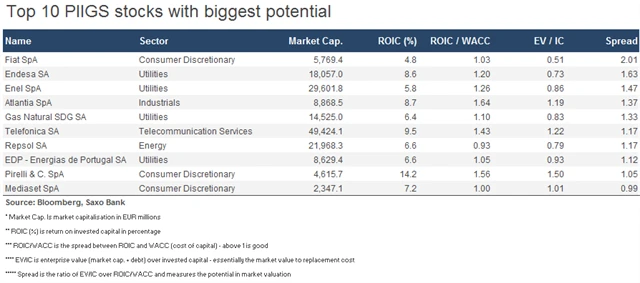 Náš přístup je založen na poměru finančních ukazatelů ROIC/WACC k EV/IC, kde je lineární vztah zhruba jedna ku jedné mezi ziskovým rozdílem (ROIC/WACC) a hodnotovým rozdílem (hodnoty podniku k investovanému kapitálu). Na základě tohoto předpokladu jsem provedl analýzu 41 nefinančních akcií ze zemí PIIGS z indexu Stoxx 600. Výsledná desítka je v tabulce.