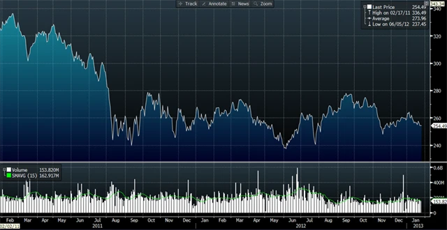 Dalším pozoruhodným faktem je to, že v TOP 10 najdeme 4 firmy ze sektoru veřejných služeb. Nejde ani tak o jejich ziskovost, jelikož v průměru pokrývají kapitálové náklady pouze na 20 %. Hnát nahoru by je měla nízká valuace ve srovnání s obnovovacími náklady, a to částečně kvůli tomu, že se u nich očekává dlouhodobá nízká ziskovost, což se ostatně nedobře odrazilo v cenách jejich akcií (viz graf sektoru veřejných služeb z indexu STOXX Europe 600 Utilities od roku 2011). Jestliže věříte, že se v roce 2013 začne v Evropě zlepšovat ekonomické klima, pak by měly ceny těchto utilit růst, aby více odpovídaly své skutečné ziskovosti.