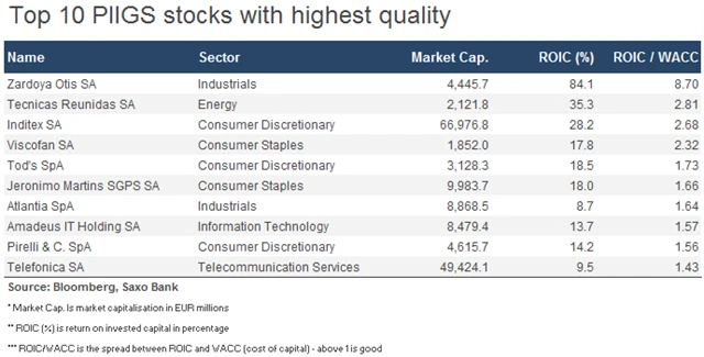 Pokud vás příliš nezajímají akcie, které by se měly vrátit k růstu, tedy ty s největším potenciálem, pak by vás mohl zaujmout výběr nejkvalitnějších akcií. Jde o 10 titulů ze zemí PIIGS s největším ziskovým spreadem, aniž bychom vzali v úvahu jejich valuaci. Povšimněte si, že tabulce dominují španělské tituly jako Zardoya Otis, Tecnicas Reunidas, Inditex, Viscofan, Amadeus IT Holding a Telefónica. Pokud si tyto akcie zachovají stabilní ziskový spread, měly by nadále růst a předvést v roce 2013 pěkný výkon.