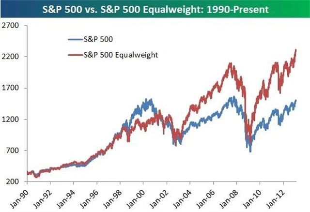 Podobná situace byla i během rally, která skončila v roce 2007. Naopak první ze tří velkých akciových vln na indexu S&P 500 okolo roku 2000 byla tažena především velkými firmami z technologického sektoru. Graf, který srovnává index vážený podle tržní kapitalizace (S&P 500) s "rovnostářským" S&P 500 Equalweight, to ukazuje naprosto jasně.
