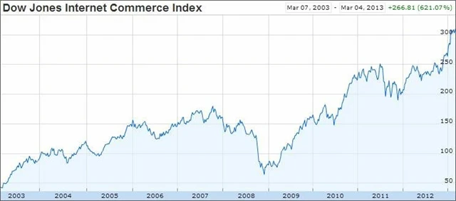 Provozovatel indexů Dow Jones začal již v roce 1998 kalkulovat odpovídající index Dow Jones Internet Commerce. Tento index vždy zohledňuje 15 akciových titulů, které jsou ovšem všechny původem z USA. Největší váhu v indexu mají nyní cestovní portál Priceline.com (10,1 %), distributor filmů Netflix (9,9 %), Ebay, Google (obě 9,8 %) a Yahoo! (9,6 %). Celosvětově největší internetový obchod Amazon.com následuje na sedmém místě s váhou 9,1 %.