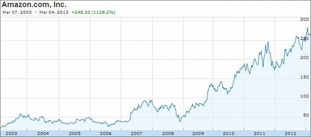 Vhodnou volbou je zřejmě internetový obchodní dům Amazon.com. Globální tržní lídr se dostal do čela i v Německu, kde v loňském roce utržil okolo 6,8 miliardy eur. Společnosti se nejprve nedařilo investory zcela uspokojit, obrat za poslední čtvrtletí 2012 sice díky vánočním nákupům stoupl o 22 % na 21,3 miliardy USD, vývoj zisku však zaostává za očekáváním – zisk 97 milionů USD je poloviční než o rok dříve. Růstový model zaměřený na cenově výhodné produkty a (většinou) bezplatné zasílání zboží tlačí na pokles ziskové marže.
