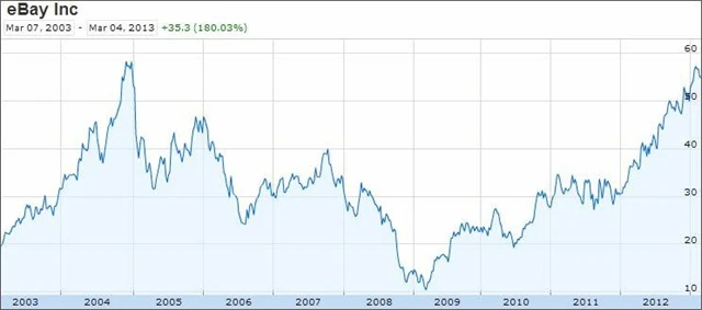Oproti Amazon.com se akcie společnosti sBay opětovně nacházejí na svém historickém maximu. Hlavní příčinou nedávného růstu cen byly poměrně dobré čtvrtletní výsledky společnosti, které těsně překonaly odhady analytiků. Celosvětové tržby vzrostly díky Vánocům o zhruba 18 %, což odpovídá 4 miliardám USD. Co se zisku týče, došlo k poklesu, avšak výnosy předcházejícího roku ovlivnil prodej aplikace Skype, který měl na zisk firmy jednorázový pozitivní efekt. Za srovnatelných podmínek by zisk eBay naopak v uplynulém roce rostl.
