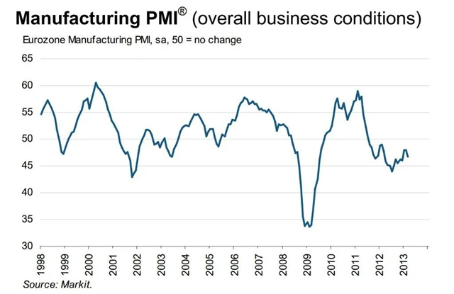Index nákupních manažerů ve zpracovatelském sektoru v eurozóně spadl na tříměsíční minimum, přestože FLASH PMI překonal o 0,2 bodu a dosáhl 46,8 bodu oproti únorovým 47,9 bodu.