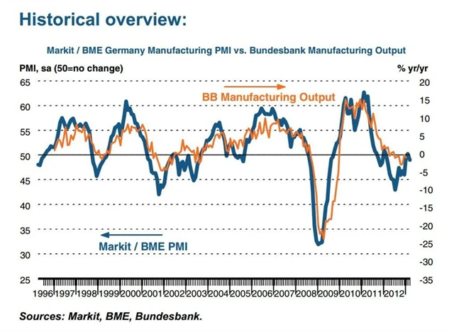Německo se v březnu propadlo pod hranici padesáti bodů - po únorovém výsledku 50,3 bodu se index nákupních manažerů ve zpracovatelském sektoru propadl na 49 bodu, přestože to bylo mírně lepší než FLASH PMI 48,9 bodu.