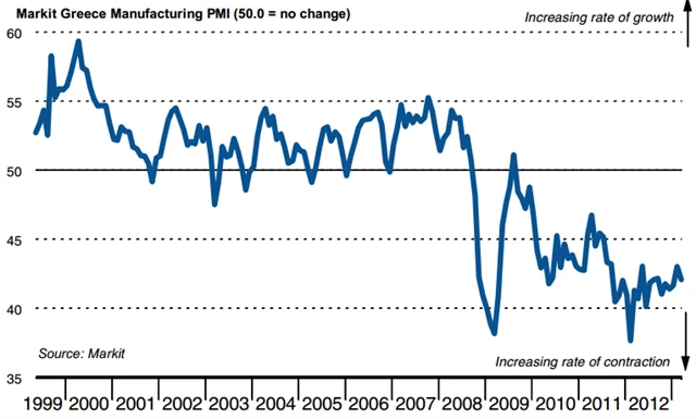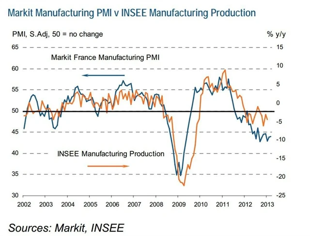 Francie zaznamenala mírné zlepšení - stále se nachází pod hranicí padesáti bodů, oproti únorovým 43,9 bodu však index nákupních manažerů ve zpracovatelském průmyslu mírně vzrostl na 44 bodů v březnu. V jednotlivých oblastech se však index propadal - čtvrtletní průměr 43,6 bodu je nejnižší od roku 2009, kdy byl průměr druhého čtvrtletí 43,1 bodu.