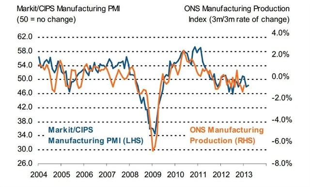 Situace ve Spojeném království se oproti předchozímu měsíci zlepšila, index nákupních manažerů ve zpracovatelském sektoru vzrostl z únorového čtyřměsíčního minima 47,9 bodu na 48,3 bodu v březnu. Nadále však zůstává pod hranicí padesáti bodů.
