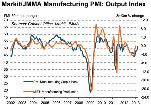 Březnová data v Japonsku naznačila oživení průmyslové produkce po 9 měsících poklesů v rámci sektoru. PMI vzrostl na 50,4 bodu z únorových 48,5 bodu. Jde o první hodnotu nad 50 (pásmo očekávání růstu) od května 2012.