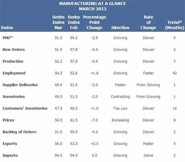 ISM: Index nákupních manažerů nečekaně klesl na 51,3 bodu z březnových 54,2 bodu. Medián odhadů analytiků byl přitom 54 bodů.