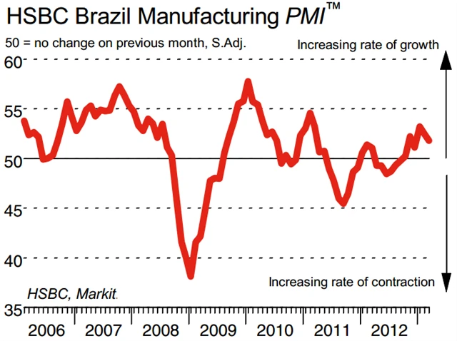 Průmyslová aktivita v největší jihoamerické zemi stále roste, ale v březnu její expanze zpomalila na 51,8 bodu z únorových 52,5 bodu.
