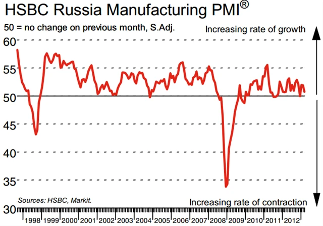 Ruský PMI ve zpracovatelském sektoru v březnu klesl na druhou nejnižší úroveň za uplynulý rok, konkrétně na 50,8 bodu z únorových 52 bodů.
