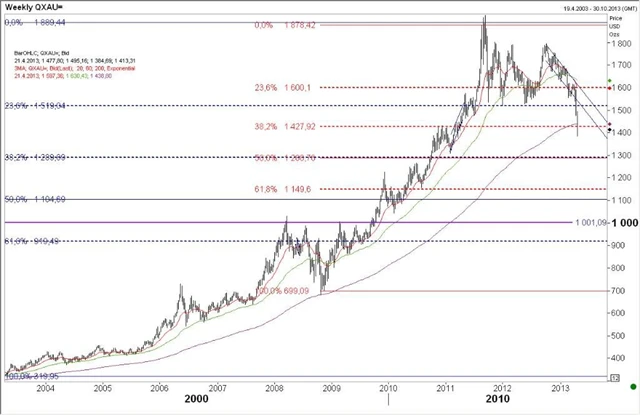 Goldman Sachs (již 10. dubna!): Snižujeme odhady ceny zlata - pro rok 2014 na 1 350 USD za trojskou unci (oproti předchozím 1 490 USD) a pro rok 2013 na 1 545 USD za trojskou unci (oproti předchozím 1 610 USD).
