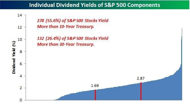 Více než čtvrtina akcií nabízí lepší dividendový výnos, než kolik může investor očekávat u 30letého amerického vládního bondu. Jde o důsledek extrémně nízkých úrokových sazeb spíše než historicky nadprůměrných dividend. A to jsou ceny akcií, z nichž se dividendové výnosy vypočítávají, poblíž historických maxim.
