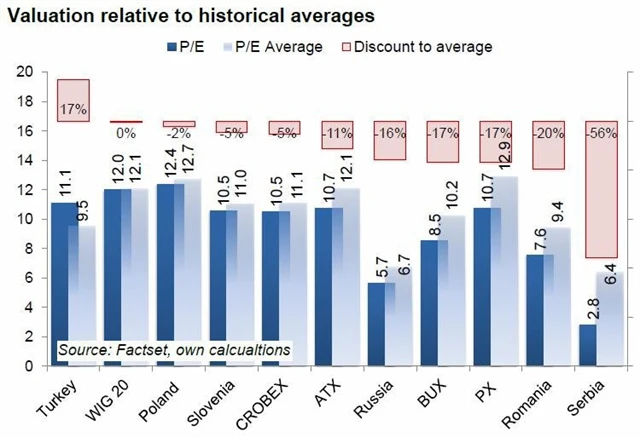 Turecko a Polsko se na základě ocenění nezdají být příliš atraktivní. Ve Slovinsku se dá možná čekat "zlevnění" akcií, pokud se země dostane do víru dluhové krize. Index PX aktuálně oproti svému průměru ocenění na základě zisku nabízí jasný růstový potenciál.
