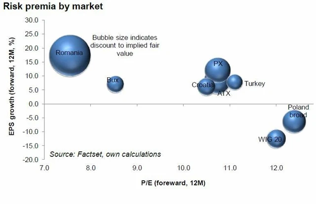 S oceněním souvisí i druhý graf, který zobrazuje nejen P/E na základě odhadovaného zisku na akcii v příštích 12 měsících, ale i samotný očekávaný růst EPS. Rakouské, české a rumunské akcie jsou vzhledem ke své "férové" ceně nejatraktivnější, nejhůře je na tom Polsko.