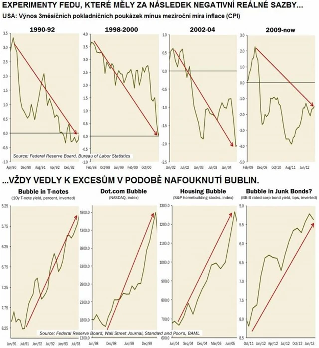 Americké dluhopisy vynášejí tak málo, že se od nich odklánějí i mnozí defenzivní investoři. Kvantitativní uvolňování měnové politiky Fedu způsobilo extrémní nárůst ceny dluhopisů a pokles výnosů. "Nikdo přesně neví, jak to s bublinou na dluhopisech dopadne, kdykoli ovšem Fed prováděl experimenty, jež ve výsledku způsobily propad reálných sazeb pod nulu, dopadlo to hodně špatně," varuje David Rosenberg, ekonom z Gluskin Sheff.