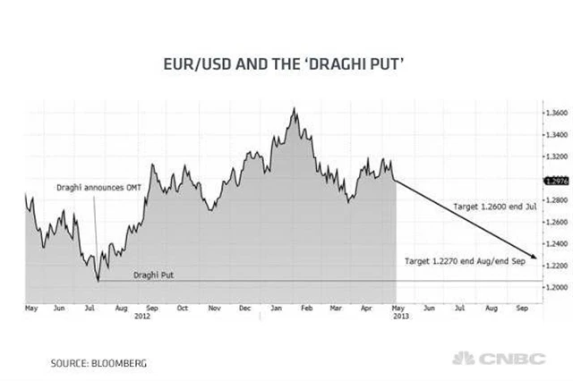 EUR/USD klesne na 1,26 do začátku července. V poklesu až k 1,23 bude pokračovat v období mezi koncem srpna a koncem září. Vliv "Draghiho vstupu" na trhy (příslib OMT), se kterým přišel v srpnu 2012, kdy bylo euro právě u hodnoty 1,21 EUR/USD, se postupně vypaří.