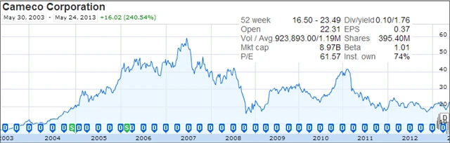 Očekávaný růst ceny uranu se v nejbližších letech výrazně promítne do ceny akcií této firmy, jejichž hodnota klesla od roku 2011 na polovinu.