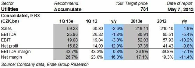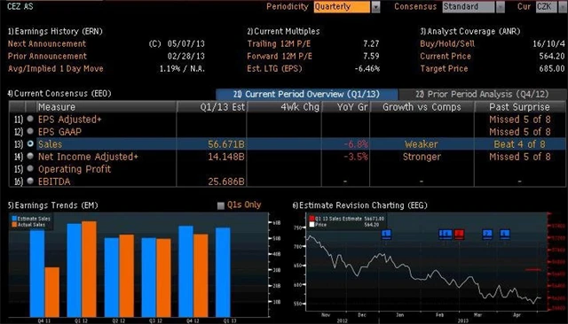 ČEZ by měl ve srovnání s minulým rokem oznámit mírně horší provozní výsledky vzhledem ke klesající produkci (očekává se 4,5% meziroční pokles kvůli přestavbě Prunéřova), ceně elektřiny (ČEZ má zafixované ceny elektřiny pro rok 2013 za 51 eur) a nižšímu počtu zdarma přidělených emisních povolenek (dodatečné náklady jsou odhadovány přes 1 miliardu Kč).