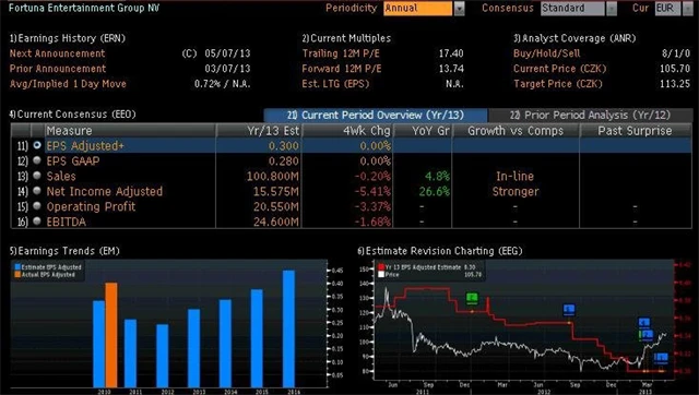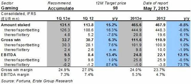 Fortuna by měla oznámit relativně solidní čísla, nicméně meziroční srovnání bude negativně ovlivněno vyšší srovnávací základnou v 1Q2012. Firma by měla snížit výrazně ztrátu z loterijního projektu, což by mělo celkově vylepšit hlavní čísla.