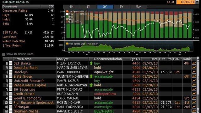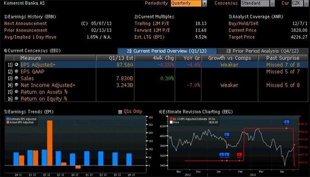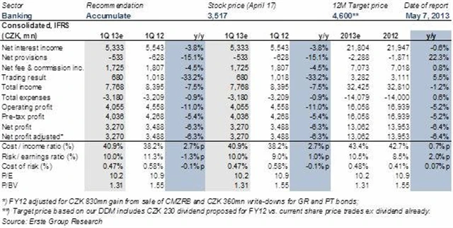 Výsledky Komerční banky za 4Q2012 byly v souladu s odhady (s vyššími než očekávanými náklady na rizika). V 1Q2013 se očekávají vyšší úrovně provizí a nadále se zhoršující marže. Zisk by mohl stoupnout o 7,7 % mezikvartálně na 3,27 miliardy Kč (-6 % meziročně) bez započtení jednorázových položek. Čisté příjmy z úroků by měly být o 2 % mezikvartálně nižší (-3,8 % meziročně). Úvěry by měly růst o 1,5 % mezikvartálně (+5,7 % meziročně) a depozita o 2,7 %. Tlak na marže bude pokračovat (-9 bazických bodů mezikvartálně).