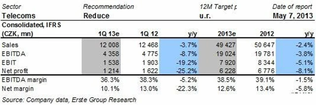 Tržby by měly klesnout o 4,7 % meziročně, tažené domácím mobilním segmentem (-6 % meziročně) a pevnými linkami (-4,7 % meziročně). Tržby z mobilního segmentu velkou měrou stáhly 62% meziroční pokles propojovacích poplatků na 0,41 Kč, nižší útraty zákazníků a konkurenční tlaky.
