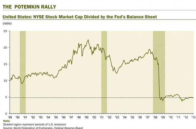 První graf ukazuje, že se v posledních letech podíl tržní kapitalizace amerických firem a bilance Fedu v podstatě nemění, což znamená, že o kolik více centrální banka napumpovala peněz do ekonomiky, o tolik více posílil zhruba také akciový trh.