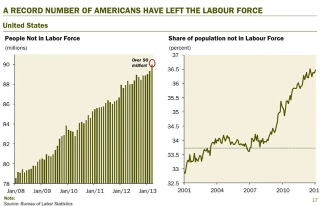 Mnozí argumentují zlepšujícím se stavem amerického trhu práce - nových míst přibývá relativně hodně, celková míra nezaměstnanosti klesá. Především druhý optimistický argument ovšem hodně pokulhává - podíl lidí, kteří již nespadají do statistiky, z níž se míra vypočítává, stále roste. Mimo takzvanou pracovní sílu bylo v březnu 90 milionů Američanů.