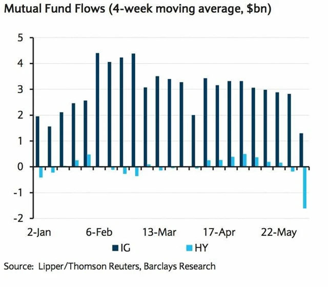 Následující graf naznačuje, že vážněji jsou postiženy rizikovější junk bondy (high yield – HY) než dluhopisy investičního stupně (investment grade – IG).