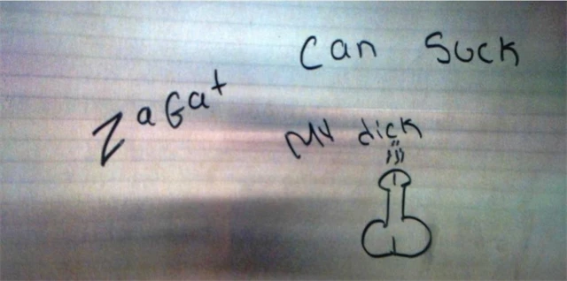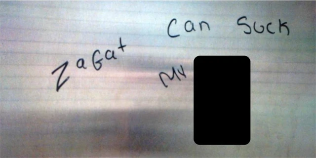 Když společnost Google převzala Zagat, vydavatele světově známých průvodců, upozorňovala, že bude potřeba reorganizace. Později své plány upřesnila a spousta editorů Zagatu se dozvěděla, že jejich smlouvy v roce 2013 nebudou obnoveny. Po obdržení e-mailu s tímto sdělením došlo ke konverzaci, v níž jedna zaměstnankyně společnosti napsala druhé: "Měla bys zajít na toalety. Je tam něco, co musíš vidět." A bylo. Pokud chcete vidět nezcenzurovanou verzi toho, co si pracovnice Google/Zagat myslí, přejděte na druhou stranu.