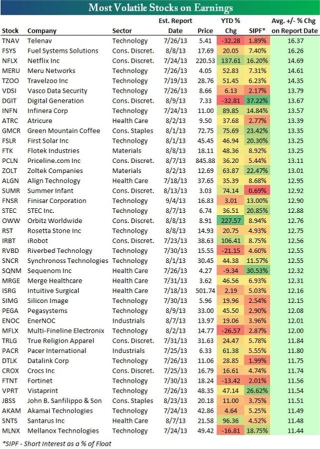 První dvě společnosti, které se do výběru dostaly, zveřejní čísla ve čtvrtek 18. července. Jde o Align Technology a Intuitive Surgical. Potom bude následovat dalších 38 firem, jejichž akcie se v posledních deseti letech po zveřejnění výsledků pohnuly v průměru alespoň o 11 %. Kdo má pevné nervy, může se na tyto firmy v následujících týdnech zaměřit.