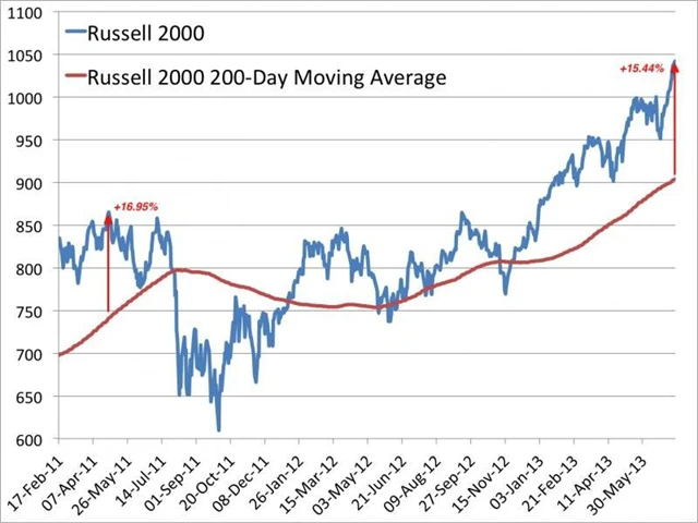 Ceny akcií menších amerických společností (small caps) sledované indexem Russell 2000 se na začátku týdne dostaly na extrémně vysoké úrovně. Tak daleko od 200denního klouzavého průměru index nebyl od května 2011. I vůči indexu S&P 500, který má za sebou řadu růstových měsíců, se Russell 2000 pohybuje výrazně výše.
