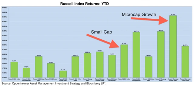 Small caps ani na současných vysokých úrovních nejsou od začátku roku nejvýkonnější ze všech "rodin" amerických akcií. Tituly s nejmenší tržní kapitalizací (micro caps, průměrná kapitalizace firmy v jejich indexu je zhruba 540 milionů USD) jsou na tom ještě lépe. Průměrná cena vůči účetní hodnotě (3,65 na začátku týdne) je sice vysoká, což značí riziko, ovšem je "vykoupena" dlouhodobým výhledem růstu zisků firem o 10 %. Vyšší riziko v tomto případě slibuje vyšší výnos.